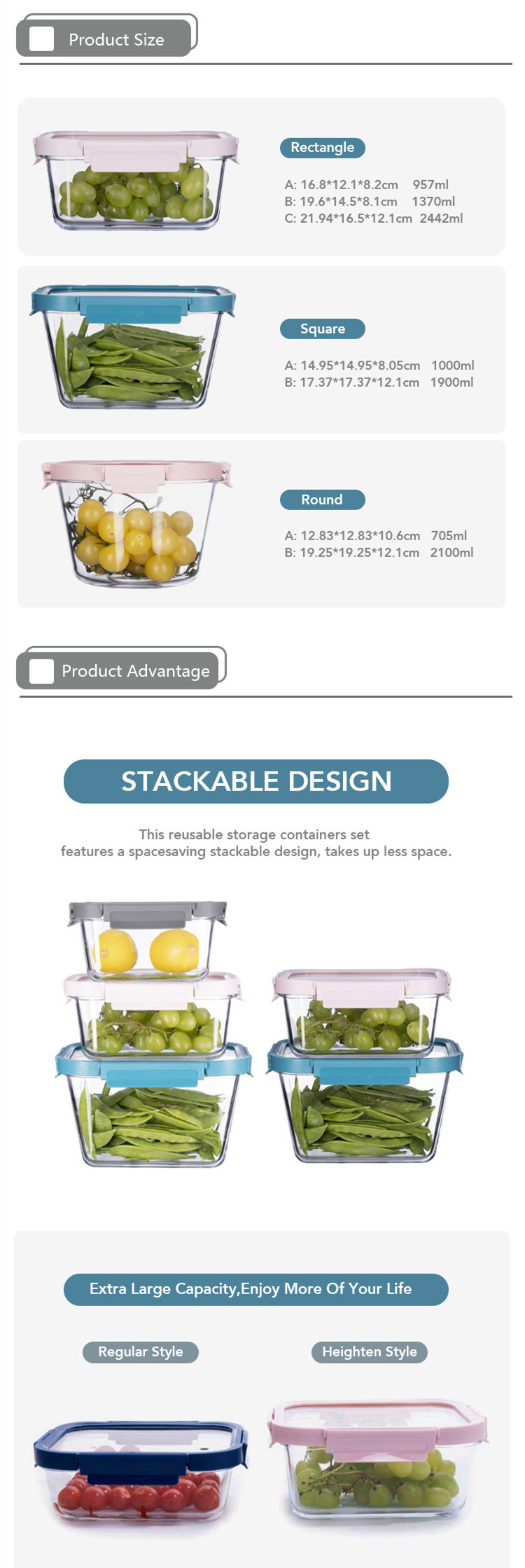 Capacity | Rectangle:957ml,1370ml,2442ml Square:1000ml,1900ml Round:705ml,2100ml | |||